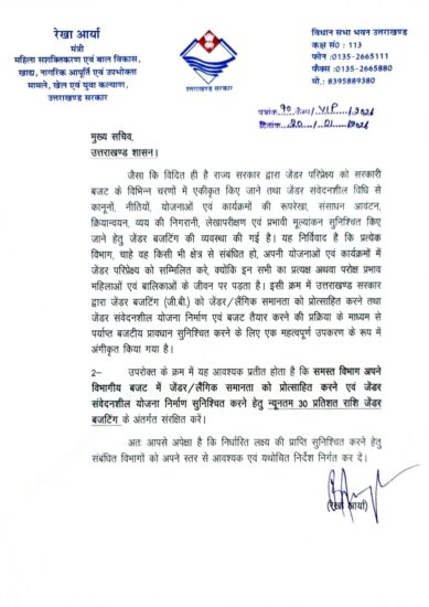 देहरादून : प्रदेश की महिला सशक्तिकरण एवं बाल विकास मंत्री रेखा आर्या ने प्रदेश के बजट का 30% महिलाओं के लिए आरक्षित करने का सुझाव दिया है। इस बारे में मंगलवार को कैबिनेट मंत्री ने मुख्य सचिव को पत्र लिखा है।