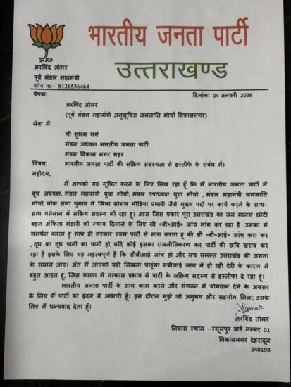 अंकिता भंडारी मामले में विकासनगर से भाजपा नेता का इस्तीफ़ा