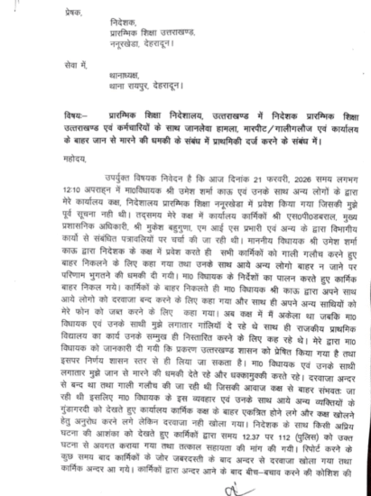 मिली जानकारी के अनुसार प्रारंभिक शिक्षा निदेशक ने थाना रायपुर में लिखित शिकायत देकर आरोप लगाया कि उनके कार्यालय में पहुंचकर दबाव बनाने, अभद्र व्यवहार और मारपीट की गई।