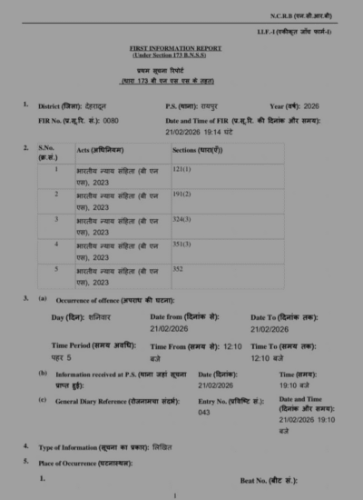 तहरीर के आधार पर पुलिस ने भारतीय न्याय संहिता, 2023 की विभिन्न धाराओं के तहत मामला दर्ज कर लिया है। एफआईआर के अनुसार घटना 21 फरवरी को दोपहर के समय की बताई गई है। पुलिस ने संबंधित धाराओं में मुकदमा दर्ज कर प्रकरण की जांच शुरू कर दी है।