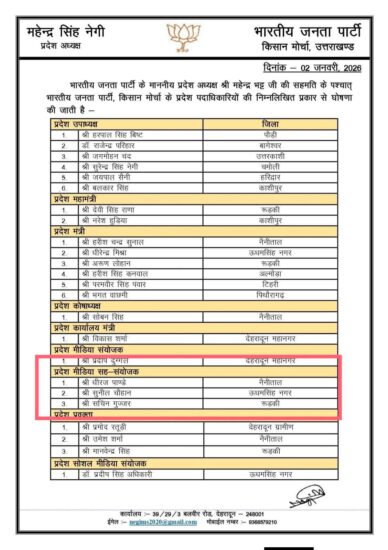 भारतीय जनता पार्टी ने सचिन गुर्जर को किसान मोर्चा में प्रदेश मीडिया सह-संयोजक की जिम्मेदारी सौंपी है। उनकी यह नियुक्ति छात्र राजनीति से लेकर युवा राजनीति और अब किसान मोर्चा तक के लंबे, संघर्षपूर्ण संगठनात्मक सफर की पहचान मानी जा रही है।