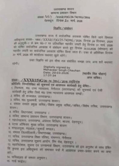 आगामी 31 मार्च, 2026 को घोषित सार्वजनिक अवकाश में संशोधन करते हुए 30.03.2026 (सोमवार) को महावीर जयंती का सार्वजनिक अवकाश घोषित किया गया है। आदेश जारी।
