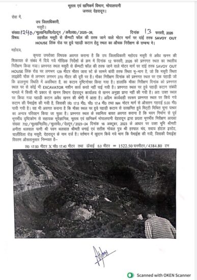 स्वीकृत मानचित्र के अनुसार निर्माण कार्य राष्ट्रीय राजमार्ग के किनारे से 4.82 मीटर एवं मध्य रेखा से 10.07 मीटर दूरी पर अनुमन्य था। टीम द्वारा निरीक्षण में पाया कि संबंधित व्यक्तियों द्वारा जेसीबी/एक्सकेवेटर से राष्ट्रीय राजमार्ग की ओर अवैध खनन किया गया तथा स्वीकृत मानकों के अनुरूप कार्य नहीं किया गया। इसके परिणामस्वरूप स्थल पर पूर्व से जमा मलबे का भूस्खलन हुआ, जिससे मार्ग की प्रतिधारक दीवार पूर्णतः क्षतिग्रस्त हो गई तथा यातायात हेतु मार्ग असुरक्षित हो गया है।