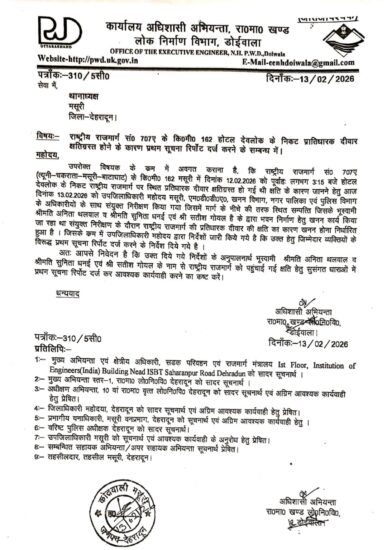 आमजन की सुरक्षा को दृष्टिगत रखते हुए उक्त मार्ग को तत्काल प्रभाव से बंद कर दिया गया है। यातायात को वैकल्पिक मार्गों मोतीलाल नेहरू मार्ग, हाथीपांव मार्ग एवं नगर पालिका मार्ग से संचालित किया जा रहा है। प्रभारी निरीक्षक, कोतवाली मसूरी को मार्ग पर पूर्ण प्रतिबंध सुनिश्चित करने एवं वैकल्पिक मार्गों पर यातायात सुचारु रखने के निर्देश दिए गए हैं।