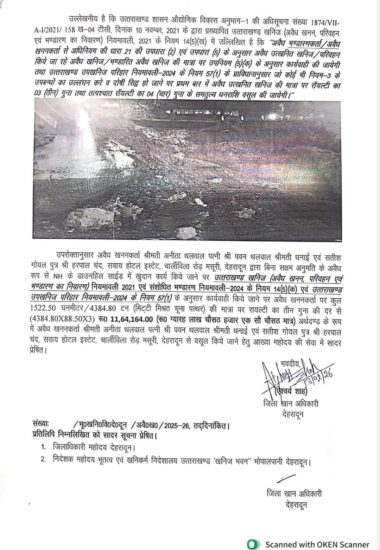 जिलाधिकारी द्वारा खनन विभाग को उत्तराखण्ड खनिज (अवैध खनन, परिवहन एवं भण्डारण का निवारण) नियमावली-2021 एवं संशोधित भण्डारण नियमावली-2024 के नियम 14(5)(क) तथा उत्तराखण्ड उपखनिज परिहार नियमावली-2024 के नियम 57(1) के अंतर्गत कार्रवाई करने के निर्देश दिए गए हैं।