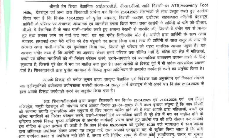 ज्ञातब्य है कि शहर के सहस्त्रधारा रोड स्थित एटीएस कॉलोनी में बिल्डर की कथित दबंगई का मामला सामने आया है। बिल्डर पुनीत अग्रवाल पर नगर निगम/एमडीडीए की जमीन पर अवैध निर्माण के विरोध में 01 डीआरडीओ मे तैनात वैज्ञानिक के साथ मारपीट का आरोप लगा है। पुलिस ने मामले में मुकदमा दर्ज कर जांच शुरू कर दी है।