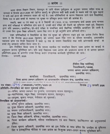 उक्त परिस्थितियों में विद्यार्थियो के हित एवं सुरक्षा को दृष्टिगत रखते हुये यह आदेश निर्गत किया जाता है कि 28.01.2026 (बुधवार) को जनपद ऊधम सिंह नगर के समस्त शासकीय, अशासकीय सहायता प्राप्त एवं निजी विद्यालयों में कक्षा 12 तक के समस्त विद्यार्थियो तथा सभी आंगनबाड़ी केन्द्रों के बच्चों हेतु अवकाश घोषित किया जाता हैं।