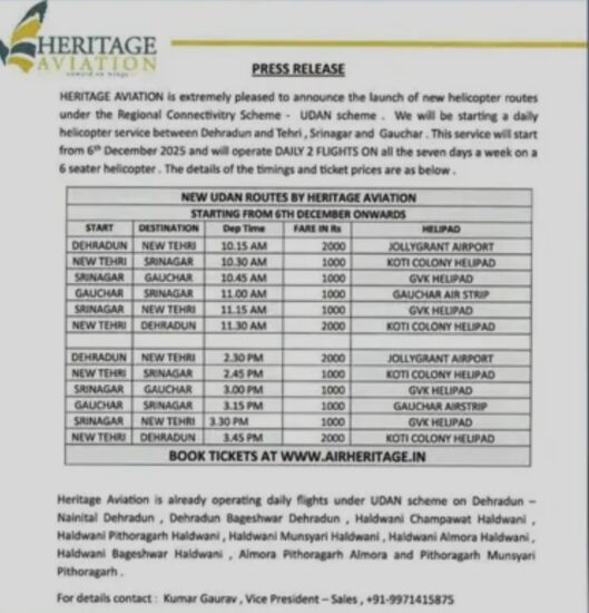 देहरादून से गौचर तक हेरिटेज हेली सेवा कल से होगी शुरू