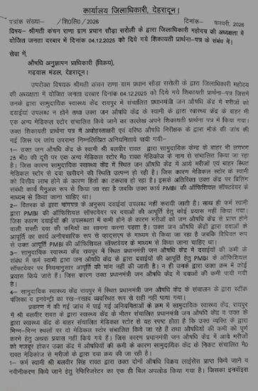 देहरादून 18 फरवरी 2026 विगत माह 04.12.2025 को जिलाधिकारी सविन बंसल की अध्यक्षता में आयोजित जनता दर्शन में सामुदायिक स्वास्थ्य केंद्र (सीएचसी) रायपुर स्थित प्रधानमंत्री जन औषधि केंद्र के संबंध में शिकायत प्रस्तुत की गई थी। शिकायत में जन औषधि केंद्र पर दवाओं की उपलब्धता न होने तथा केंद्र संचालक द्वारा निकट ही एक निजी मेडिकल स्टोर संचालित किए जाने का उल्लेख किया गया था।
