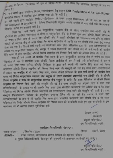 अनियमितताओं के आधार पर वरिष्ठ औषधि निरीक्षक द्वारा जनहित में बलवीर सिंह रावत को निर्गत सामुदायिक स्वास्थ्य केंद्र रायपुर स्थित प्रधानमंत्री जन औषधि केंद्र एवं निकटवर्ती मै० रावत मेडिकोज के औषधि विक्रय लाइसेंस निरस्त किए जाने की संस्तुति की गई है। जिला प्रशासन जनहित में सस्ती एवं सुलभ दवा उपलब्ध कराने के प्रति प्रतिबद्ध है तथा किसी भी प्रकार की अनियमितता पर कठोर कार्रवाई की जाएगी।