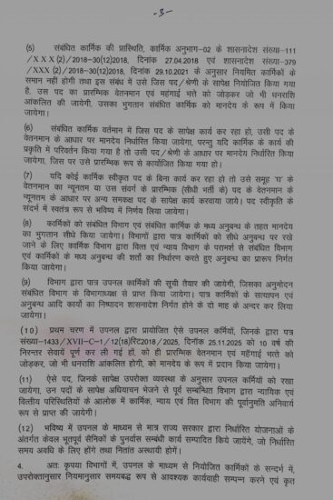 (10) प्रथम चरण में उपनल द्वारा प्रायोजित ऐसे उपनल कर्मियों, जिनके द्वारा पत्र संख्या-1433/XVII-C-1/12 (18) रिट2018/2025, 25.11.2025 को 10 वर्ष की निरन्तर सेवायें पूर्ण कर ली गई हों, को ही प्रारम्भिक वेतनमान एवं महँगाई भत्ते को जोड़कर, जो भी धनराशि आंकलित होगी, को मानदेय के रूप में प्रदान किया जायेगा।