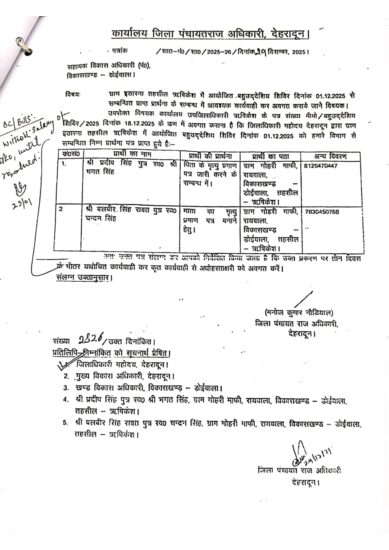 जिलाधिकारी सविन बंसल की अध्यक्षता में जिले के विकास खंड डोईवाला ग्राम इठारना, तहसील ऋषिकेश में 01.12.2025 को आयोजित बहुउद्देशीय शिविर में प्राप्त शिकायतों के क्रम में जिला प्रशासन ने सख्त कार्रवाई की है। ग्राम पंचायत गौहरी माफी निवासी प्रदीप सिंह पुत्र स्व० भगत सिंह द्वारा अपने पिताजी का मृत्यु प्रमाण पत्र जारी किए जाने तथा बलबीर सिंह रावत पुत्र स्व० चन्दन सिंह द्वारा अपनी माता स्व० जयवन्ती देवी का मृत्यु प्रमाण पत्र जारी न किए जाने संबंधी शिकायत प्रस्तुत की गई थी।