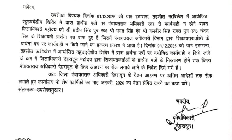 इसके बावजूद पंचायतराज स्तर पर समयबद्ध कार्यवाही न किए जाने की शिकायत जिलाधिकारी को प्राप्त हुई। शिकायतकर्ताओं के प्रार्थना पत्रों पर अपेक्षित कार्रवाई में लापरवाही पाए जाने पर जिलाधिकारी ने संज्ञान लेते हुए प्रकरण के निस्तारण तक जिला पंचायत राज अधिकारी, देहरादून के वेतन आहरण पर अग्रिम आदेशों तक रोक लगाने के निर्देश दिए थे, जिसके फलस्वरुप जिला पंचायत राज अधिकारी, देहरादून के वेतन आहरण पर रोक लगा दी गई है।