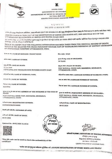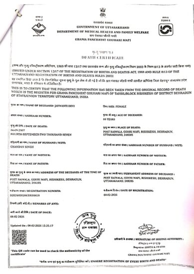 वेतन रोकने की कार्रवाई के तत्पश्चात संबंधित ग्राम पंचायत विकास अधिकारी, ग्राम पंचायत गौहरी माफी द्वारा प्रदीप सिंह के पिता स्व० भगत सिंह तथा बलबीर सिंह रावत की माता स्व० जयवन्ती देवी का मृत्यु प्रमाण पत्र 08.02.2026 को जारी कर दिया गया है। प्रकरण के निस्तारण उपरांत जिला पंचायत राज अधिकारी, देहरादून के वेतन आहरण पर लगी रोक हटाए जाने के संबंध में पत्रावली उच्च स्तर पर प्रस्तुत की गई है।