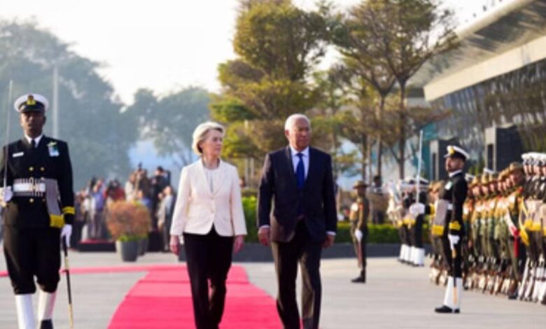 गणत्रंत दिवस समारोह में शामिल होने के लिए यूरोपीय परिषद के अध्यक्ष एंटोनियो लुइस सैंटोस दा कोस्टा और यूरोपीय आयोग की अध्यक्ष उर्सुला वॉन डेर लेयेन रविवार शाम 5 बजे के करीब राजधानी दिल्ली पहुंचे। दिल्ली पहुंचने पर दोनों मेहमानों को गार्ड ऑफ ऑनर दिया गया। बता दें कि दोनों 77वें गणतंत्र दिवस समारोह के मुख्य अतिथि हैं। यह पहली बार है जब यूरोपीय संघ के दो शीर्ष अधिकारी एक साथ भारत के गणतंत्र दिवस समारोह में भाग ले रहे हैं।