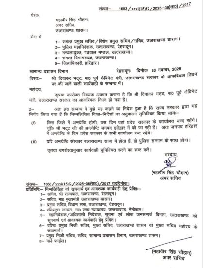 (i)जिस जिले में अन्त्येष्टि होगी, उस दिन वहां प्रदेश सरकार के कार्यालय बन्द रहेंगे। चूंकि भट्ट की अन्त्येष्टि जनपद हरिद्वार में की जा रही हैं। अतः जनपद हरिद्वार में अन्त्येष्टि के दिन प्रदेश सरकार के सभी कार्यालय बन्द रहेंगे।