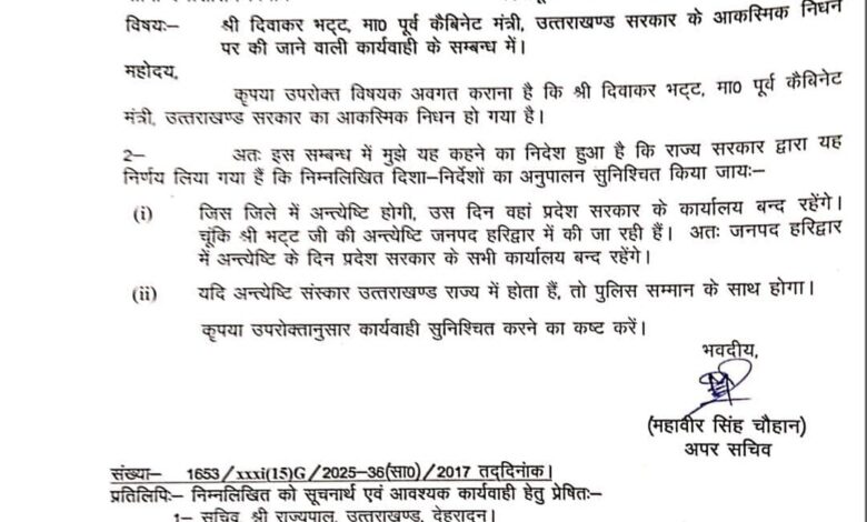 विषयः- दिवाकर भट्ट, पूर्व कैबिनेट मंत्री, उत्तराखण्ड सरकार के आकस्मिक निधन पर की जाने वाली कार्यवाही के सम्बन्ध में।