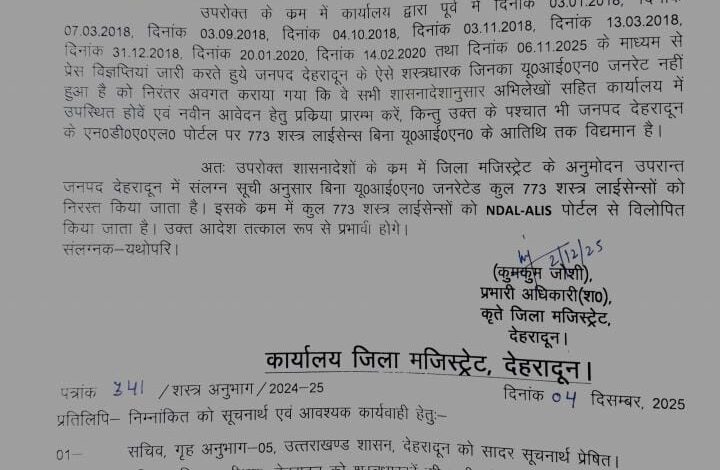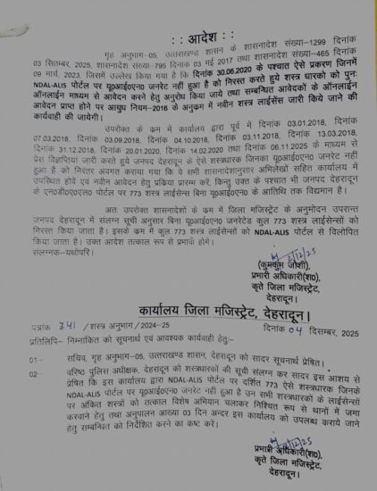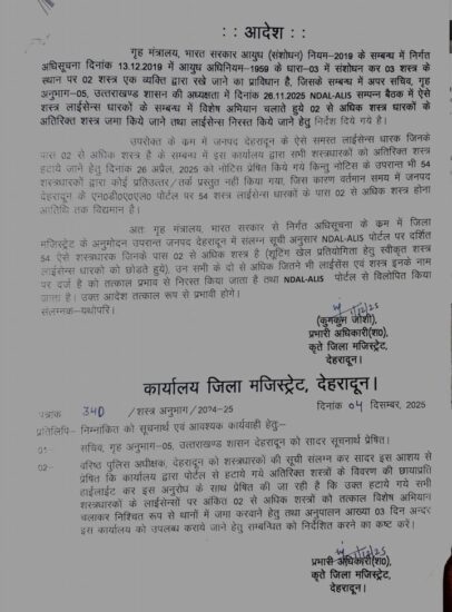 उत्तराखण्ड शासन के गृह अनुभाग-05 द्वारा निर्गत शासनादेश 03 सितम्बर 2025, शासनादेश 03 मई 2017 तथा शासनादेश 09 मार्च 2023 के क्रम में जिला प्रशासन देहरादून द्वारा शस्त्र लाइसेंसों के संबंध में कड़ा निर्णय लिया गया है।