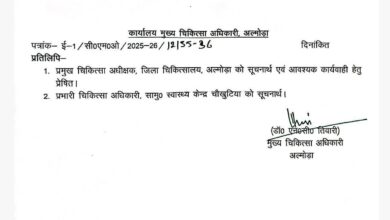 अल्मोड़ा: दो विशेषज्ञ चिकित्सकों का चौखुटिया सीएचसी में किया गया तबादला अल्मोड़ा। जिला अधिकारी अल्मोड़ा के पत्रांक संख्या 394/सत्रह-ए०जे०ए०/2024-25 23…